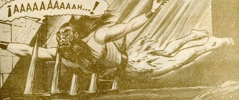 En la historieta muere ensartado en estacas de madera en el fondo de una antigua trampa egipcia, en la versión radial von Kraufen y Mekón se matan mutuamente.
